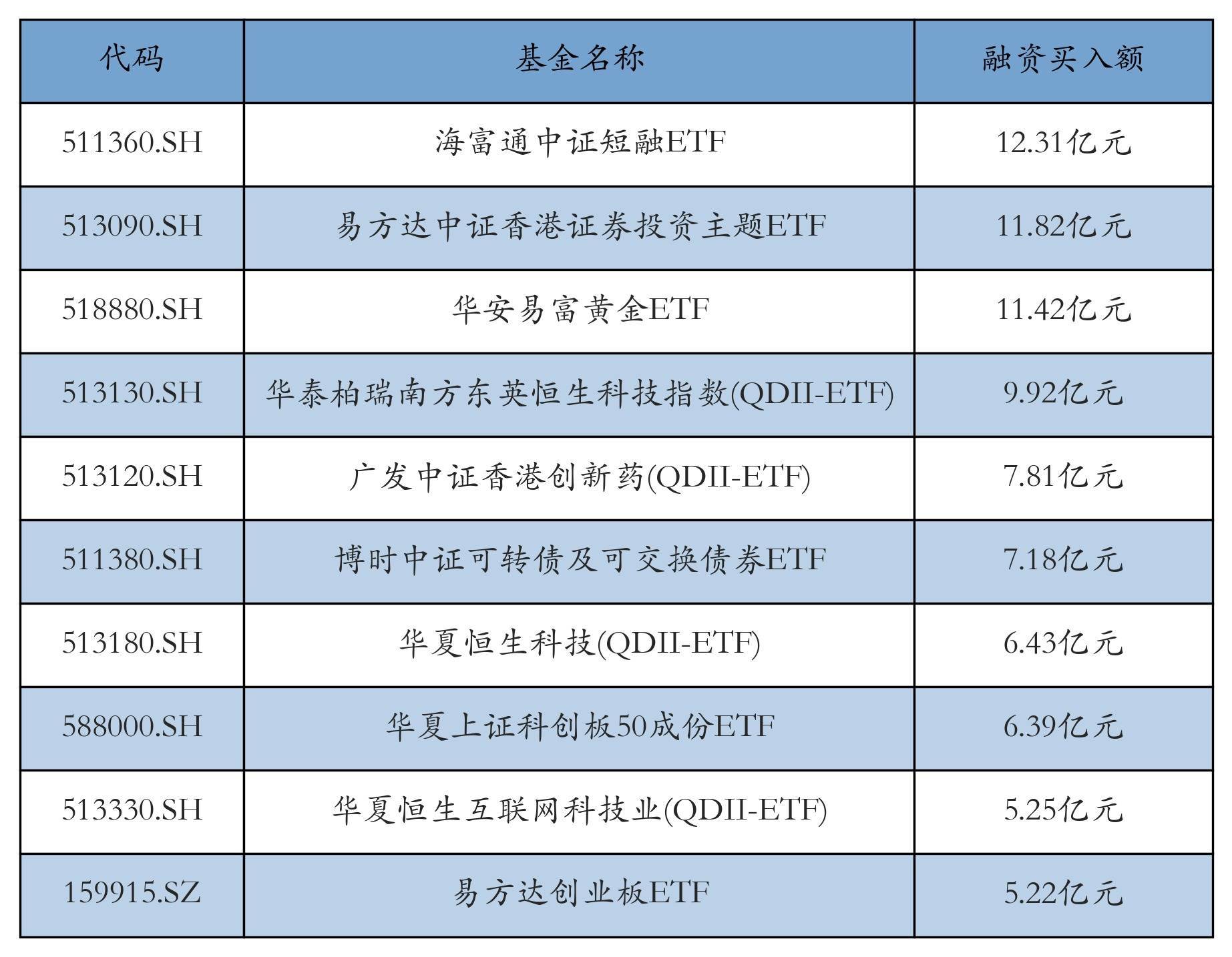 11月12日ETF融资买入额前三位分别为:海富通中证短融ETF(12.31亿元)、易方达中证香港证券投资主题ETF(11.82亿元)和华安易富黄金ETF(11.42亿元)闪电策略,前10具体见下表: