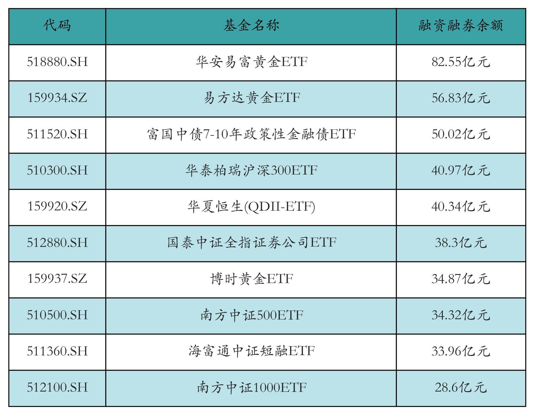 11月12日ETF两融余额前三位分别为:华安易富黄金ETF(82.55亿元)、易方达黄金ETF(56.83亿元)和富国中债7-10年政策性金融债ETF(50.02亿元),前10具体见下表: