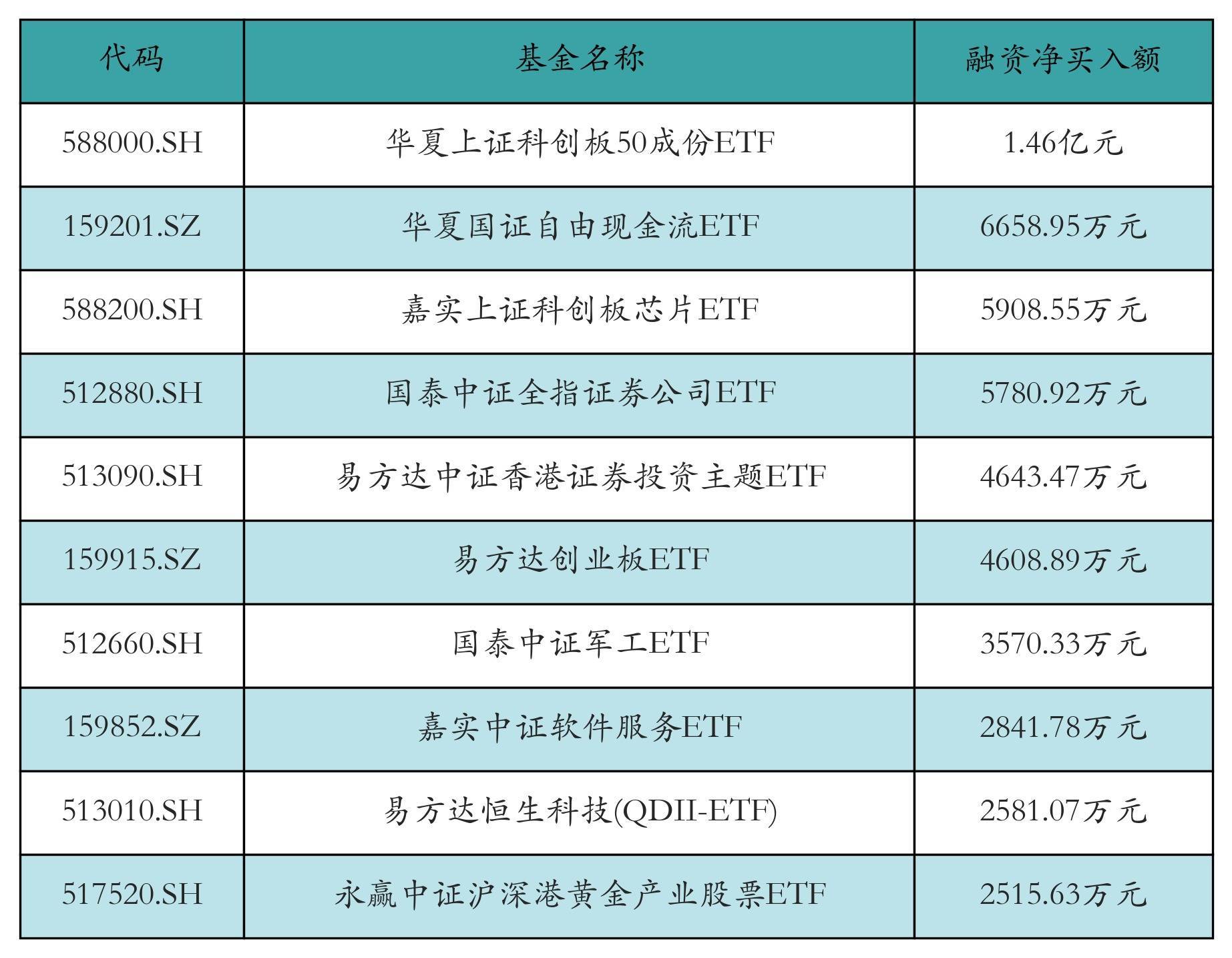 11月12日ETF融资净买入额前三位分别为:华夏上证科创板50成份ETF(1.46亿元)、华夏国证自由现金流ETF(6658.95万元)和嘉实上证科创板芯片ETF(5908.55万元),前10具体见下表: