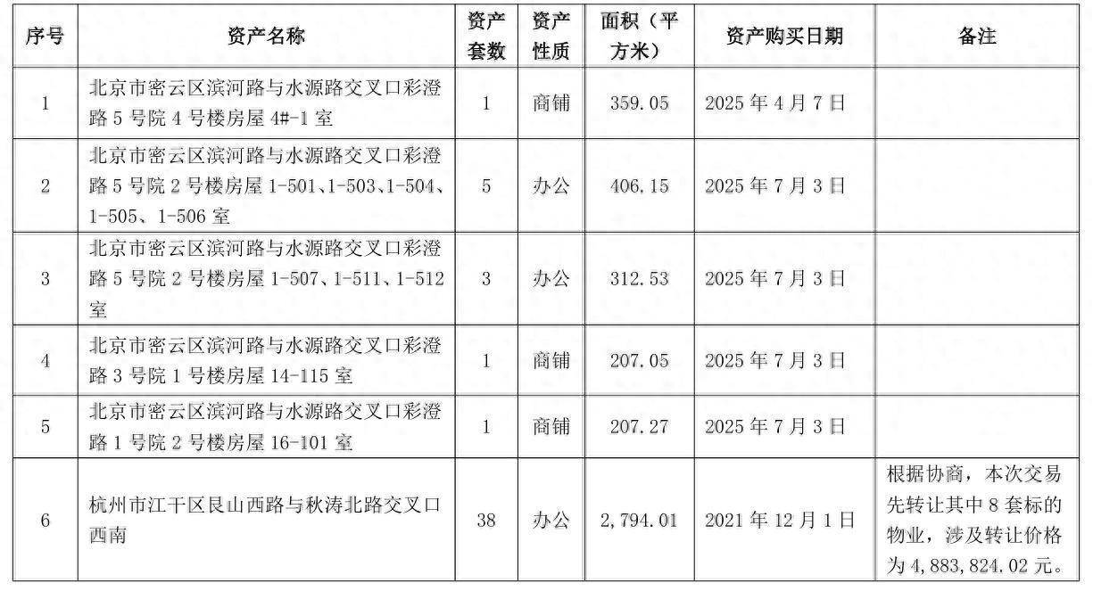 值得注意的是,交易标的中,北京市密云区滨河路与水源路交叉口彩澄路3号院1号楼房屋14-115室、北京市密云区滨河路与水源路交叉口彩澄路5号院2号楼房屋1-507、1-511、1-512室等购买日期为2025年7月3日。换言之,东方雨虹购入上述资产不足5个月便急于出手。